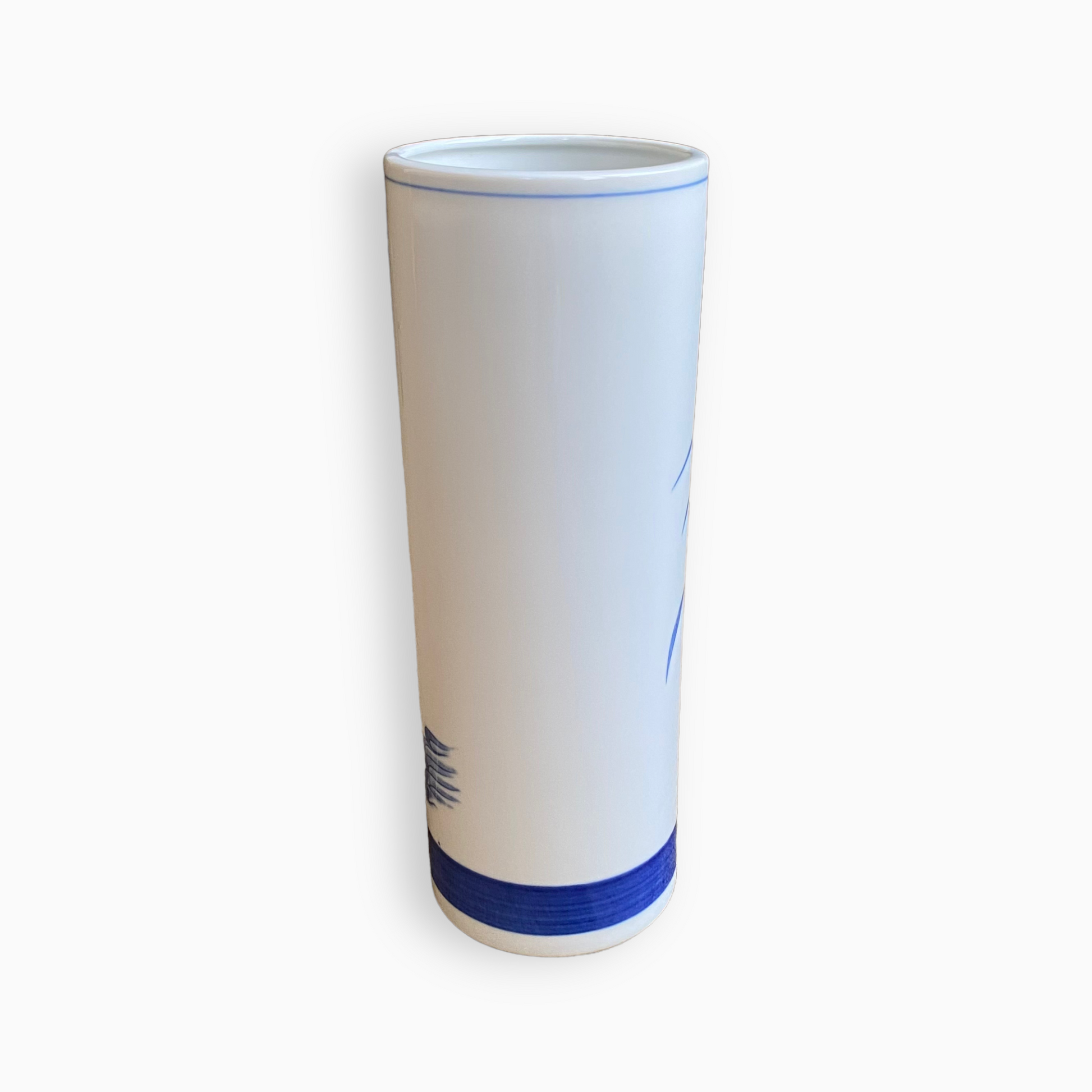 Vintage blue and white cylinder vase with lovely floral design. Made in Japan.