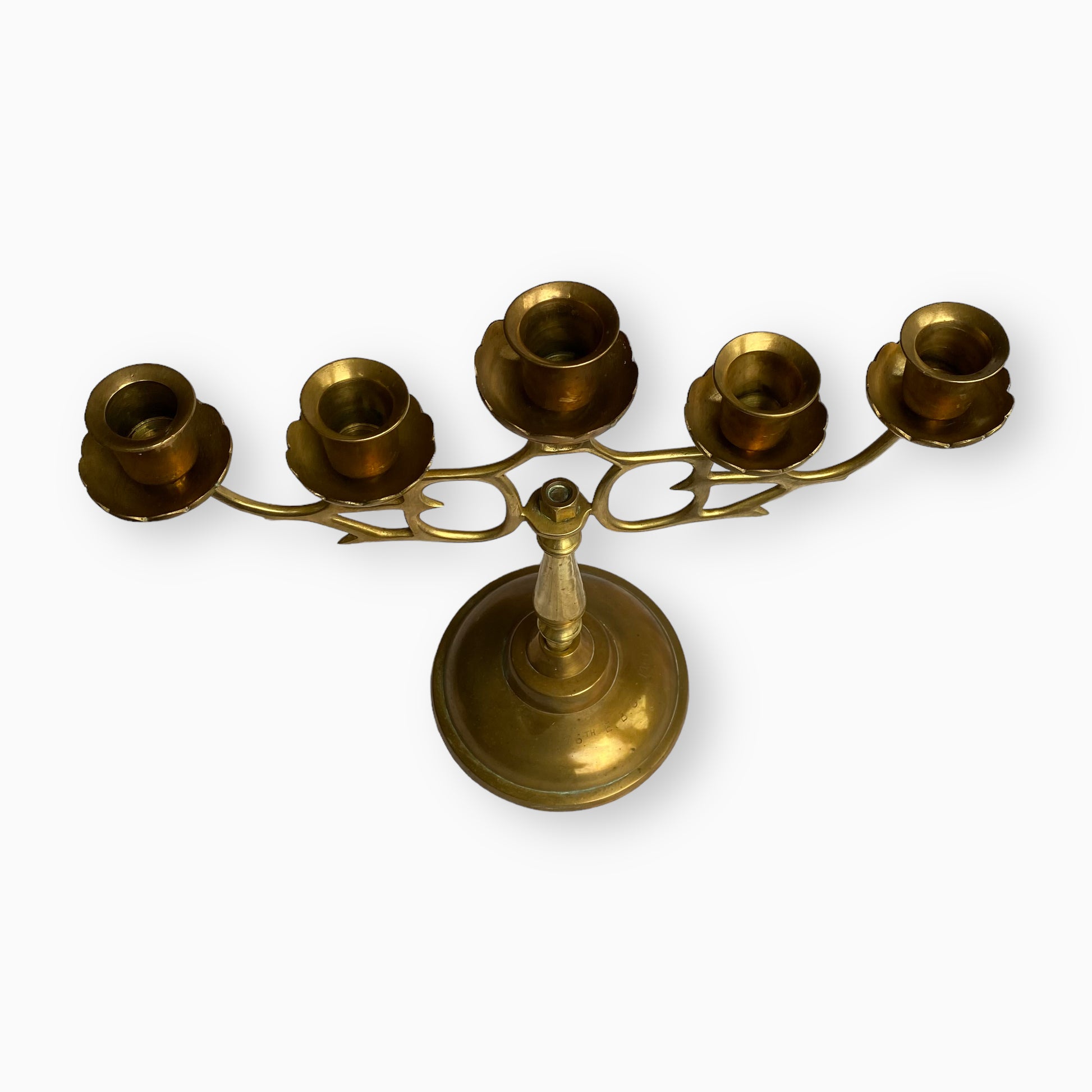 Stunning solid brass candelabra with five arms. Base was engraved in the 1960's. In good vintage condition with wear and patina appropriate for its age.