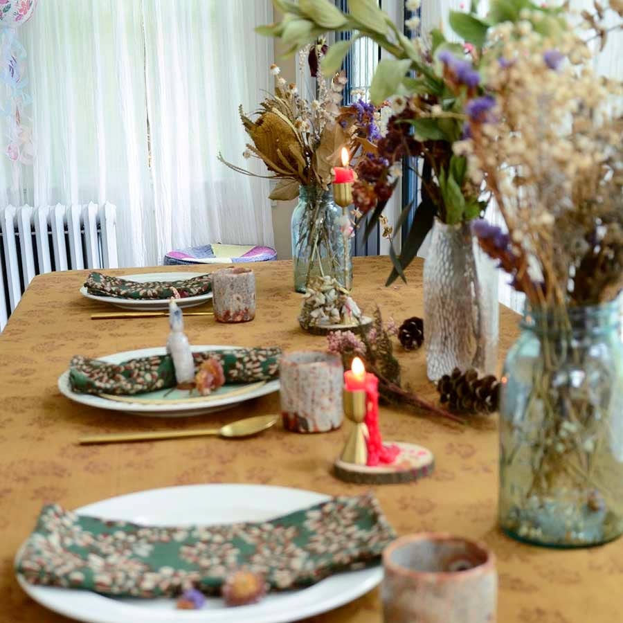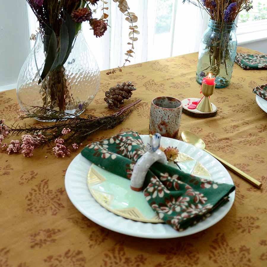 These table napkins are hand-block printed on handwoven organic cotton using traditional techniques. The design features layered floral clusters in earthy red and ivory over a rich green base, creating a pattern that feels both lively and grounded. Amar, which means “eternal,” is a fitting name for the timeless charm of this blooming design.