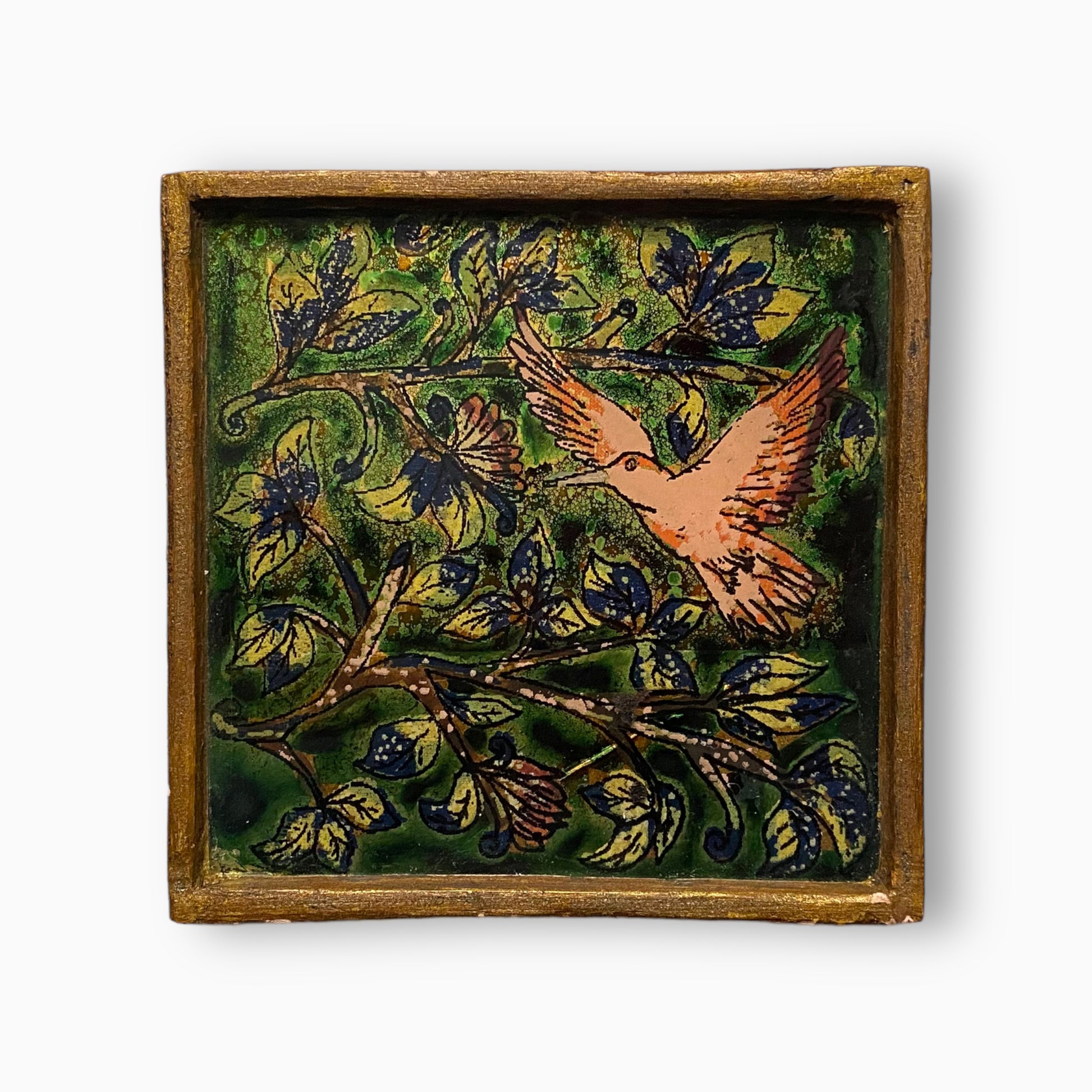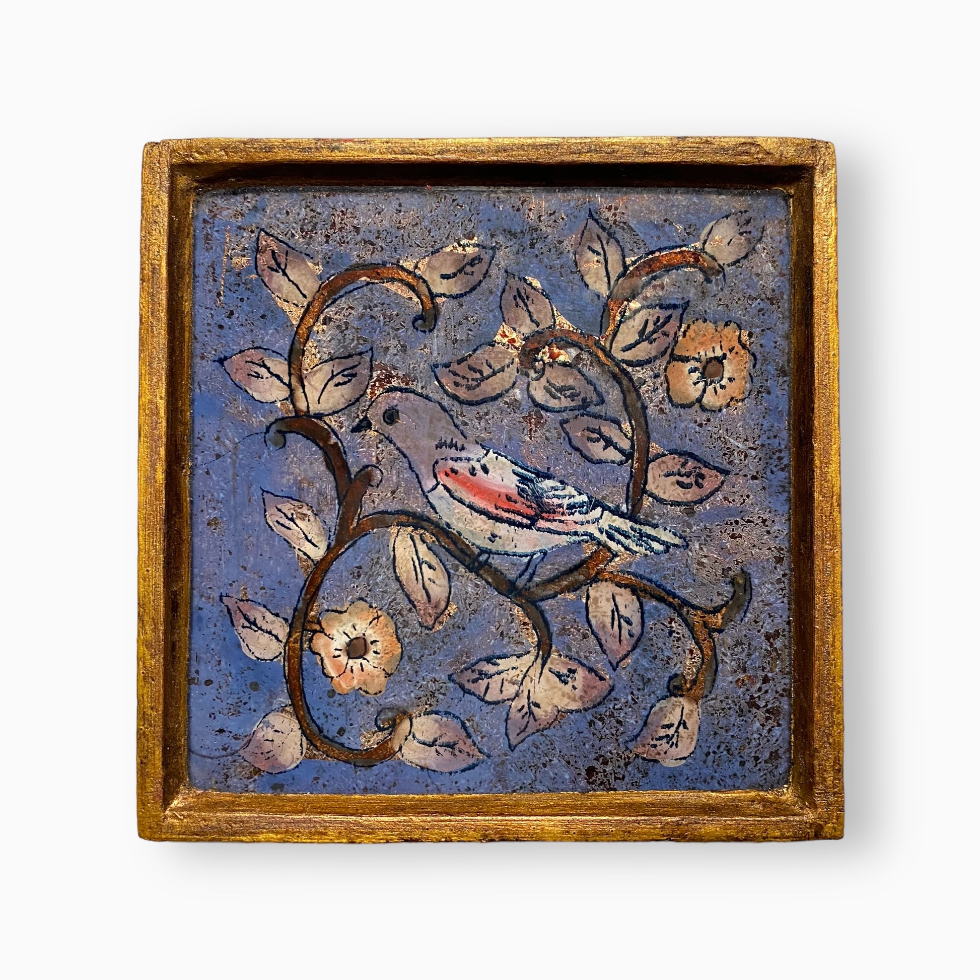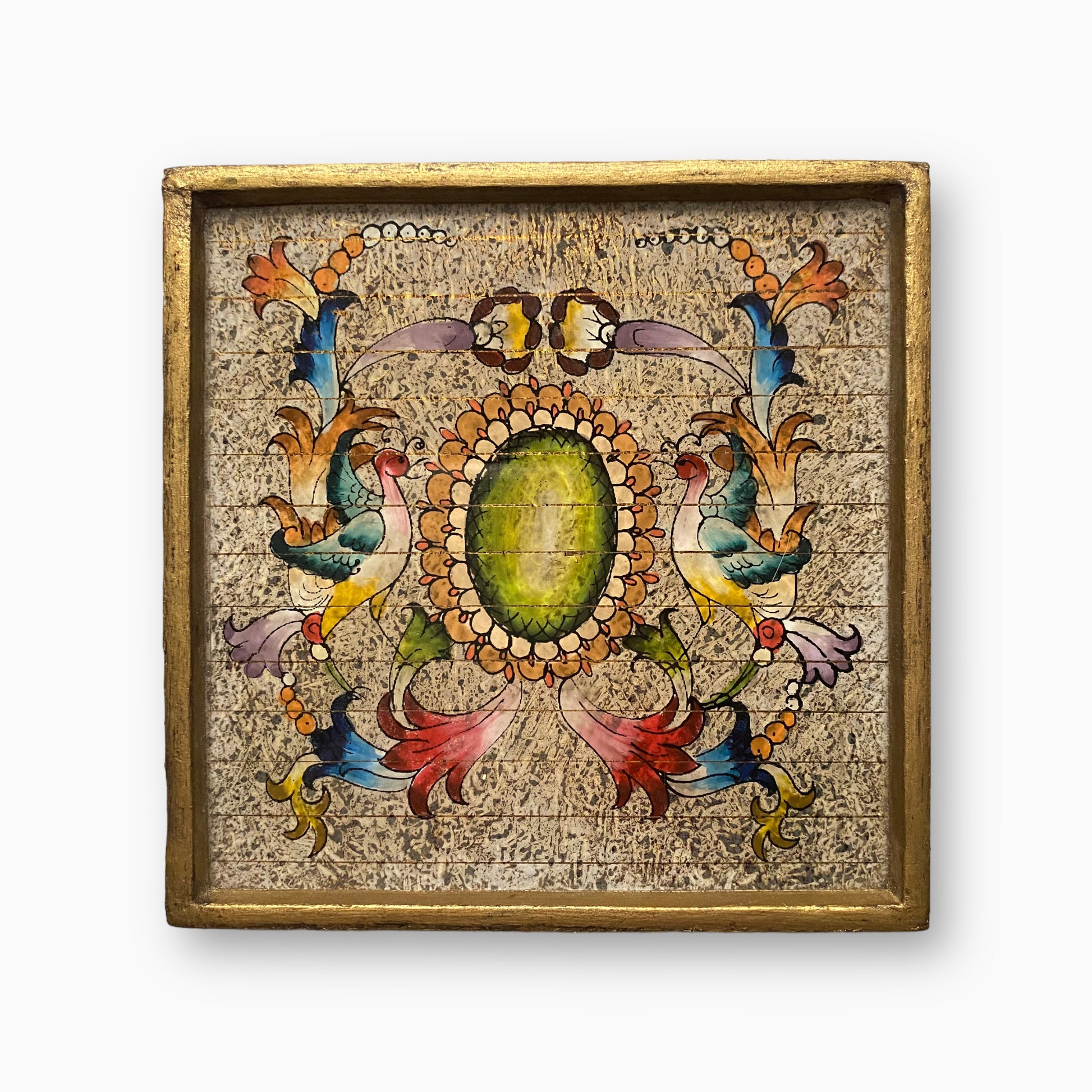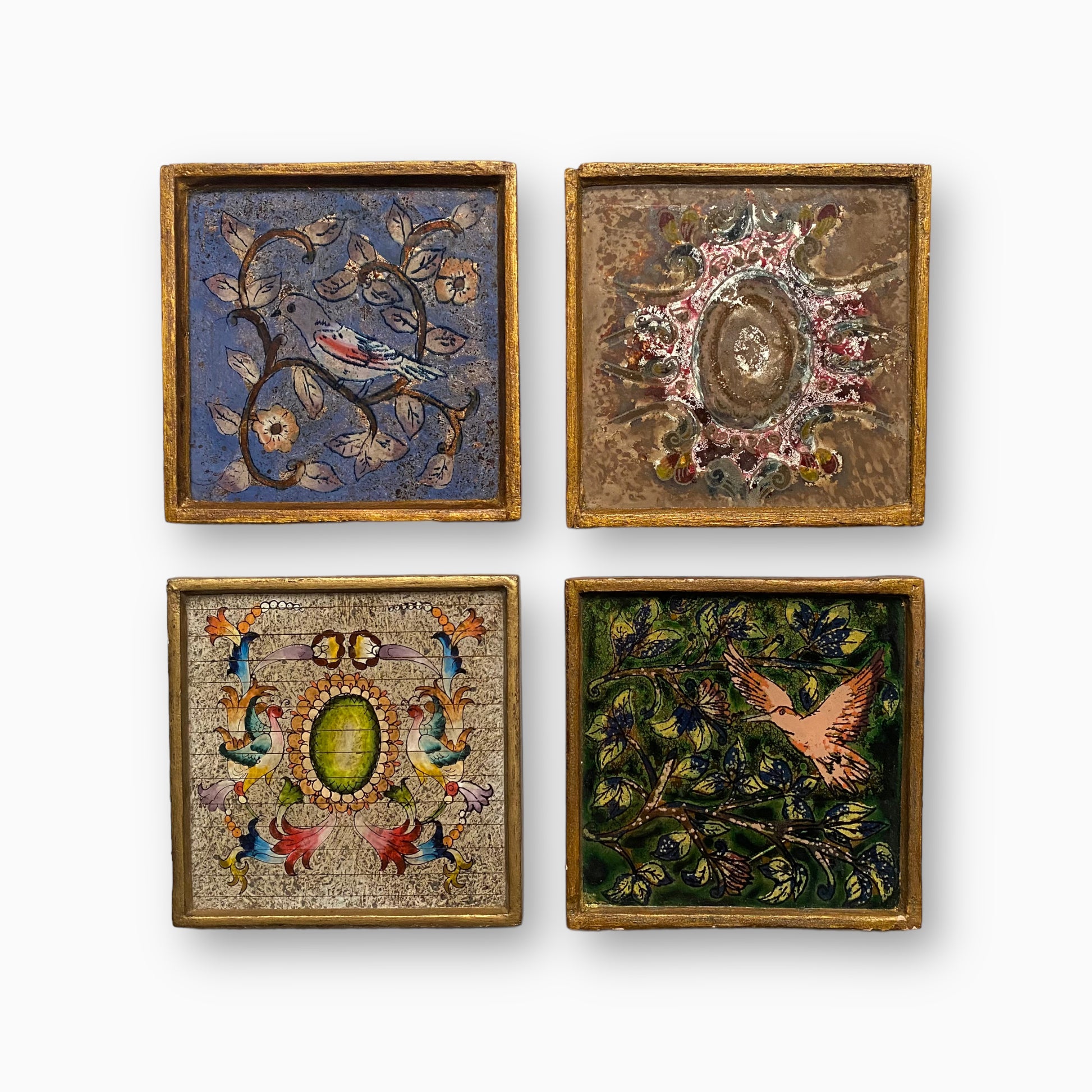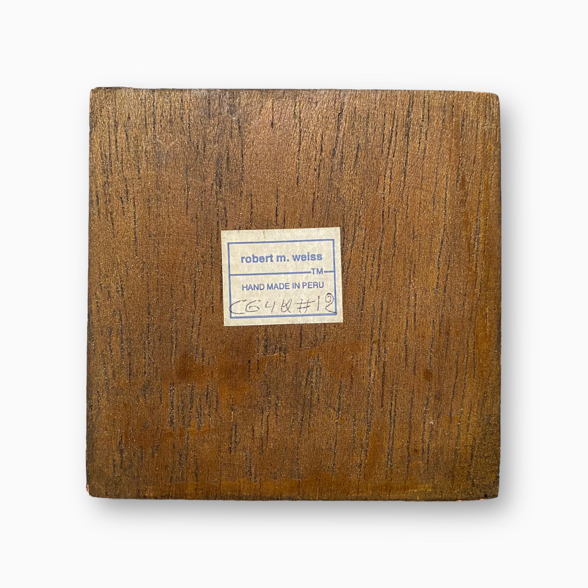 Add an element of whimsy to your barware collection with this beautiful hand-painted wood and glass coaster set. They were made in Peru by Robert Weiss using a technique called reverse painting.
