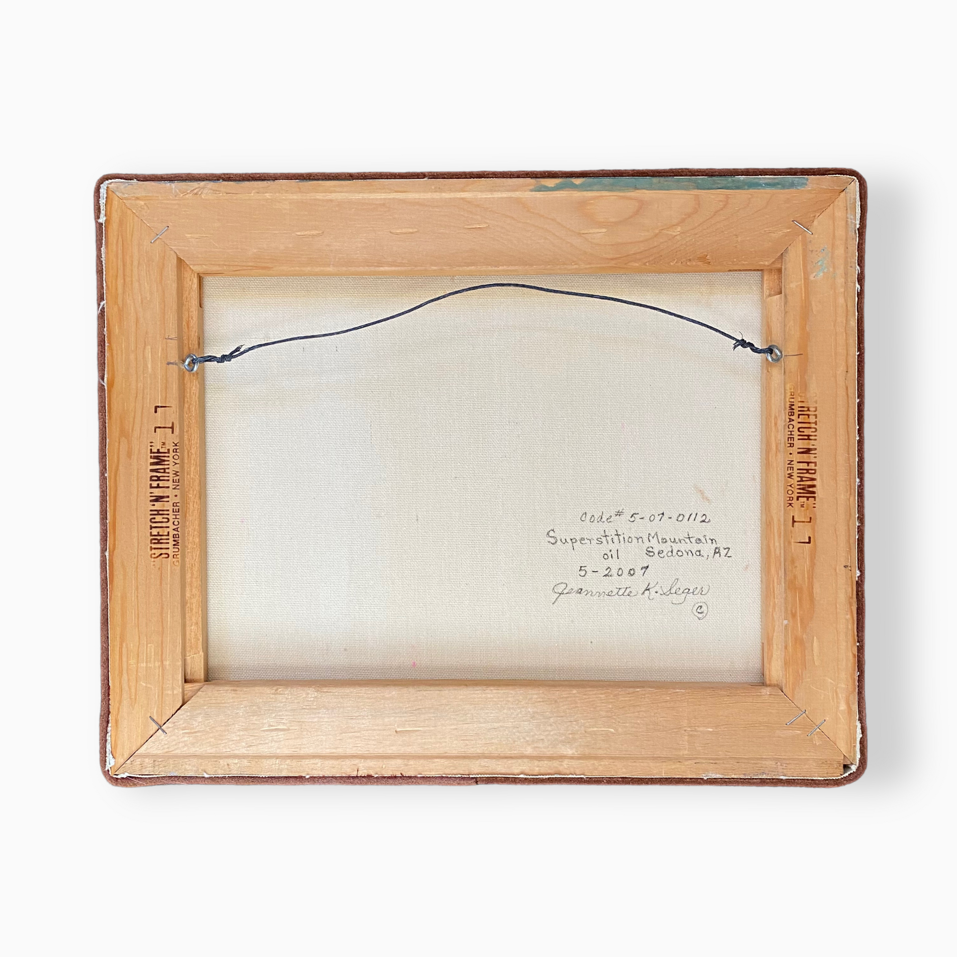 Painting of Superstition Mountain in Sedona, Arizona signed by J.K. Seger. Oil on canvas in leather studded frame, 2007.