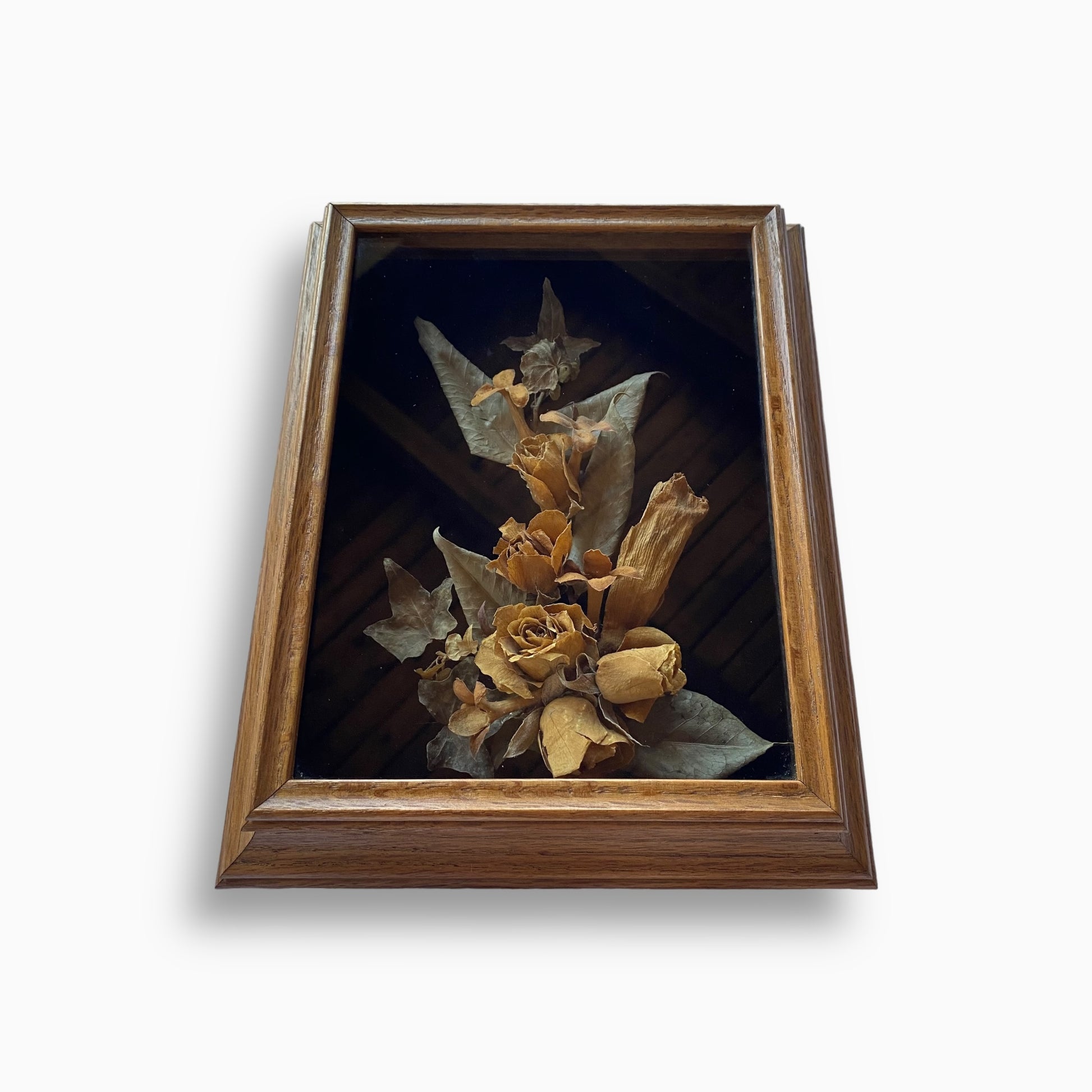 Beautiful and moody shadow box with dried floral arrangement. Mounted by hand on black velvet. Glass and wood frame are in good condition.