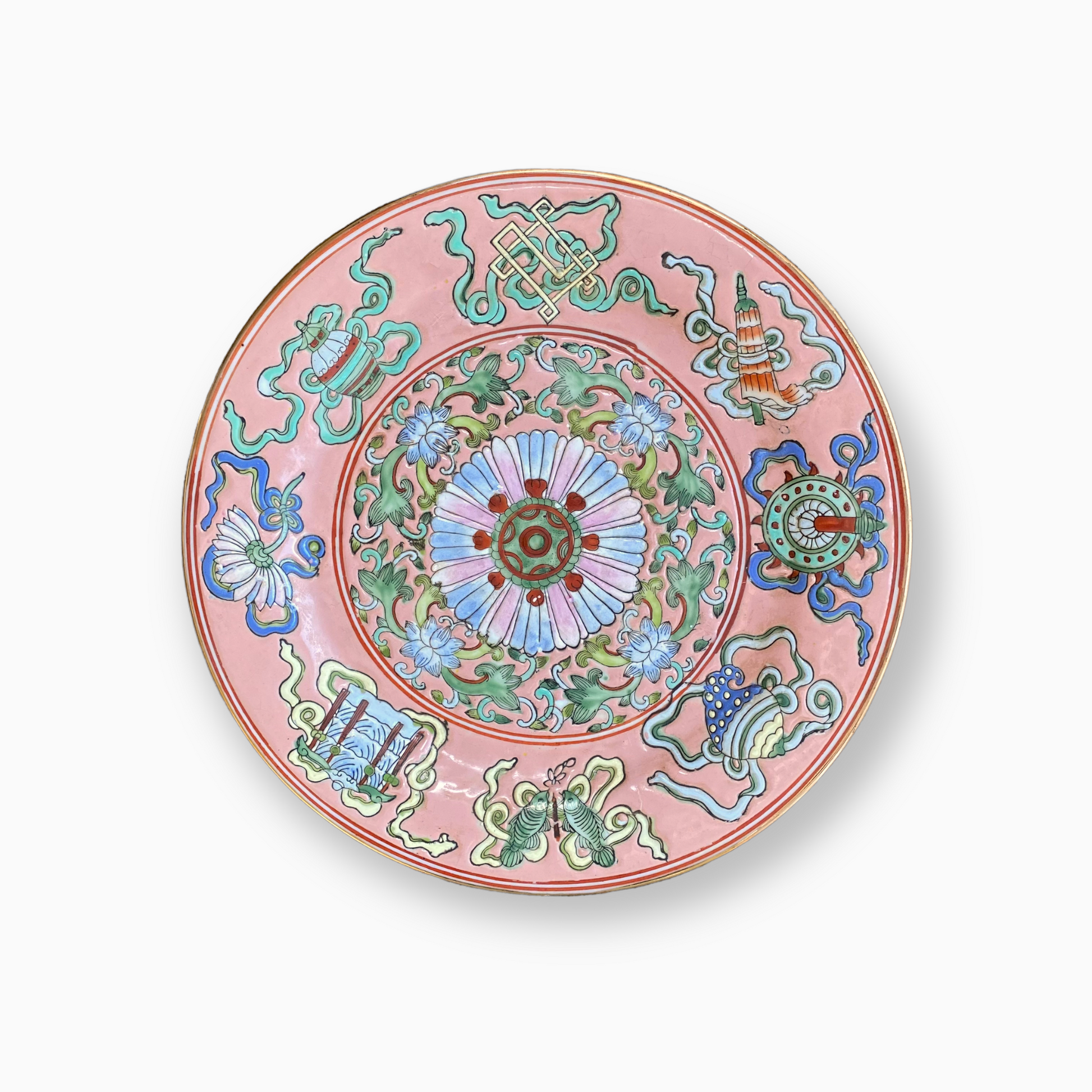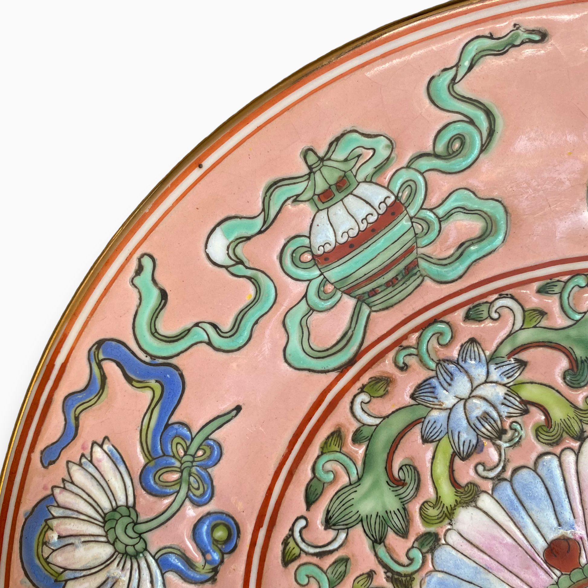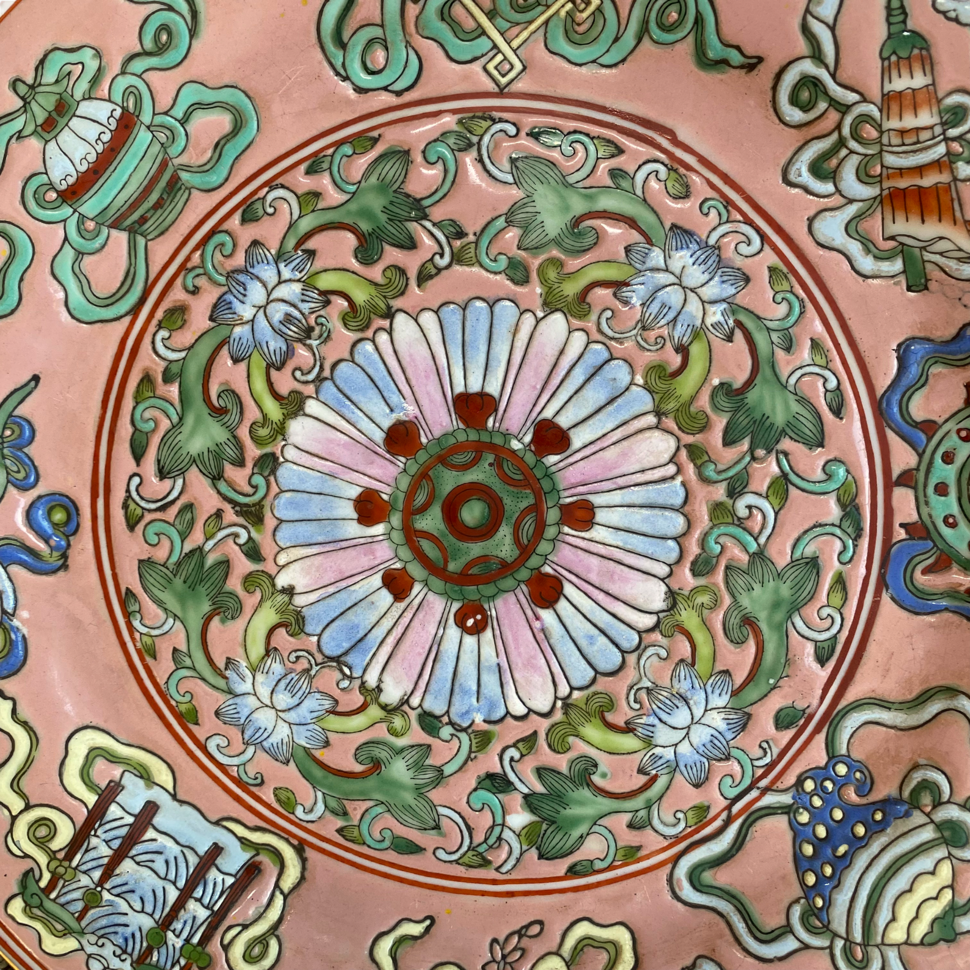Antique salmon colored plate made during the Qing Dynasty (likely mid to late 1800s) in China. Intricately painted with traditional designs in vivid colors. Six-character mark on the back of plate.