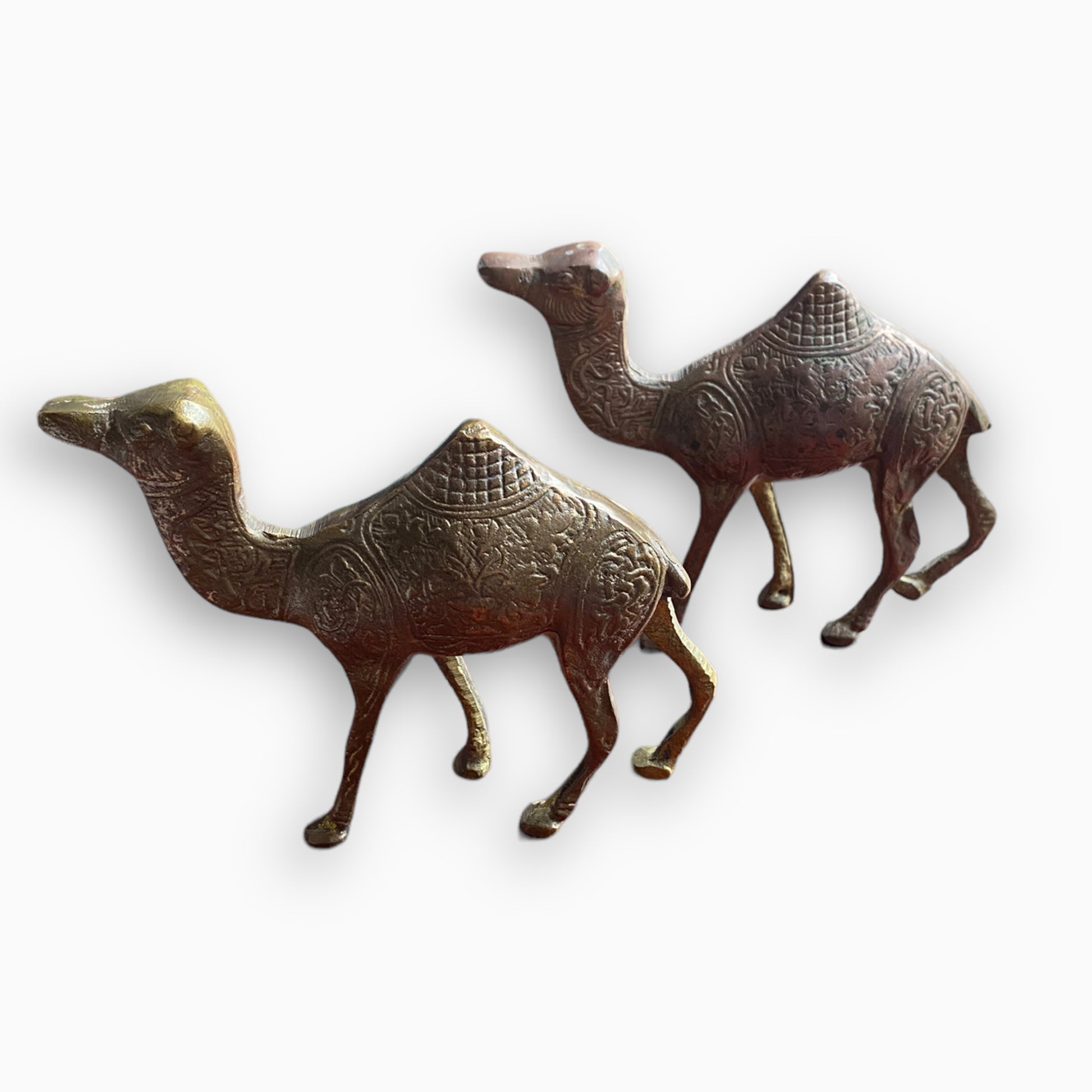 Pair of ornately engraved brass camels. One figurine is in better shape than the other (see photos of patina).