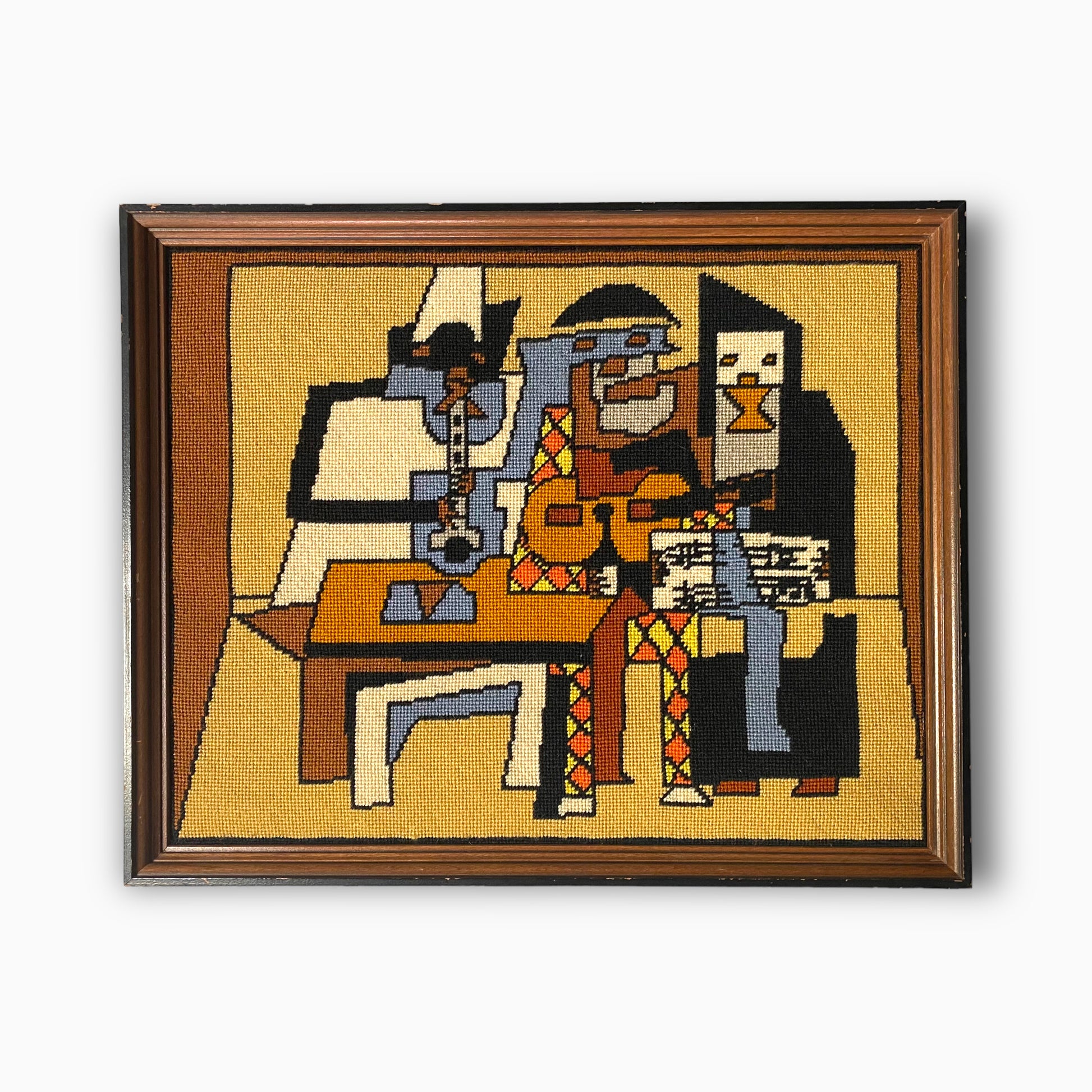 Vintage needlepoint recreating Pablo Picasso's 1921 cubist painting "Three Musicians."