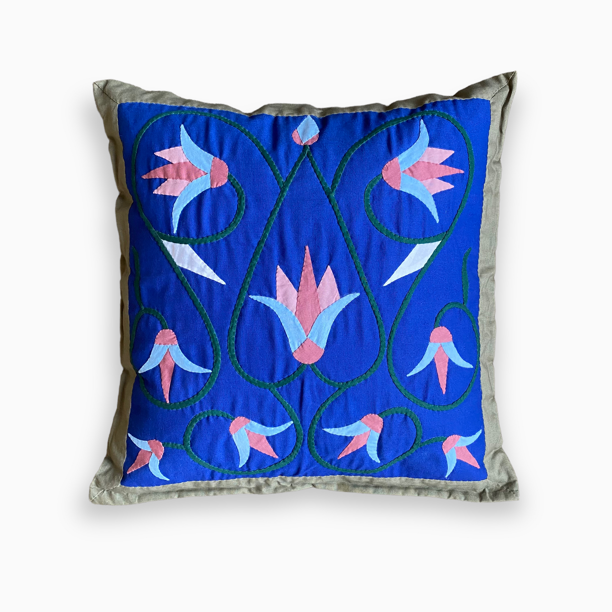 Blue quilted throw pillow adorned with pink and light blue flowers. In great condition with tiny imperfections.