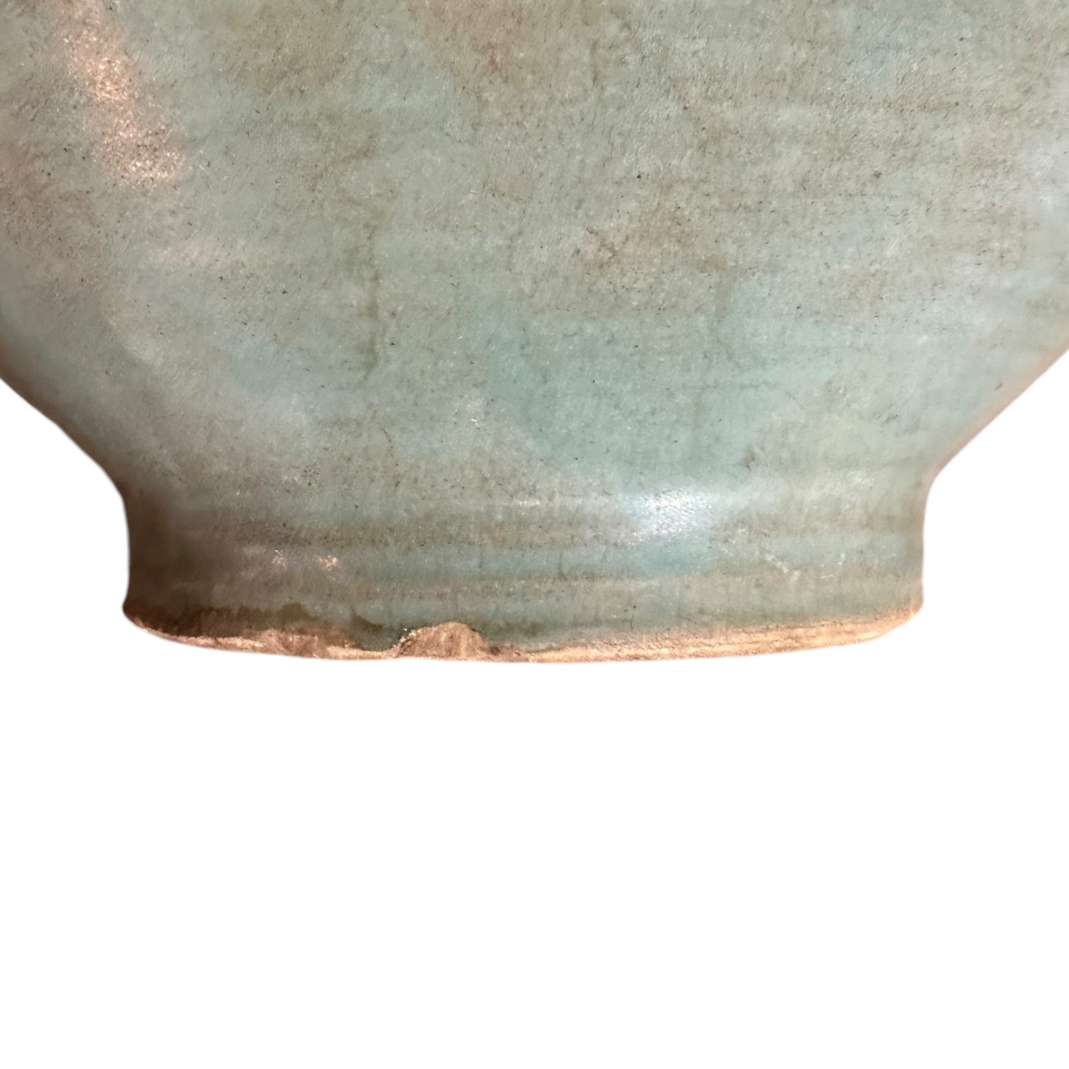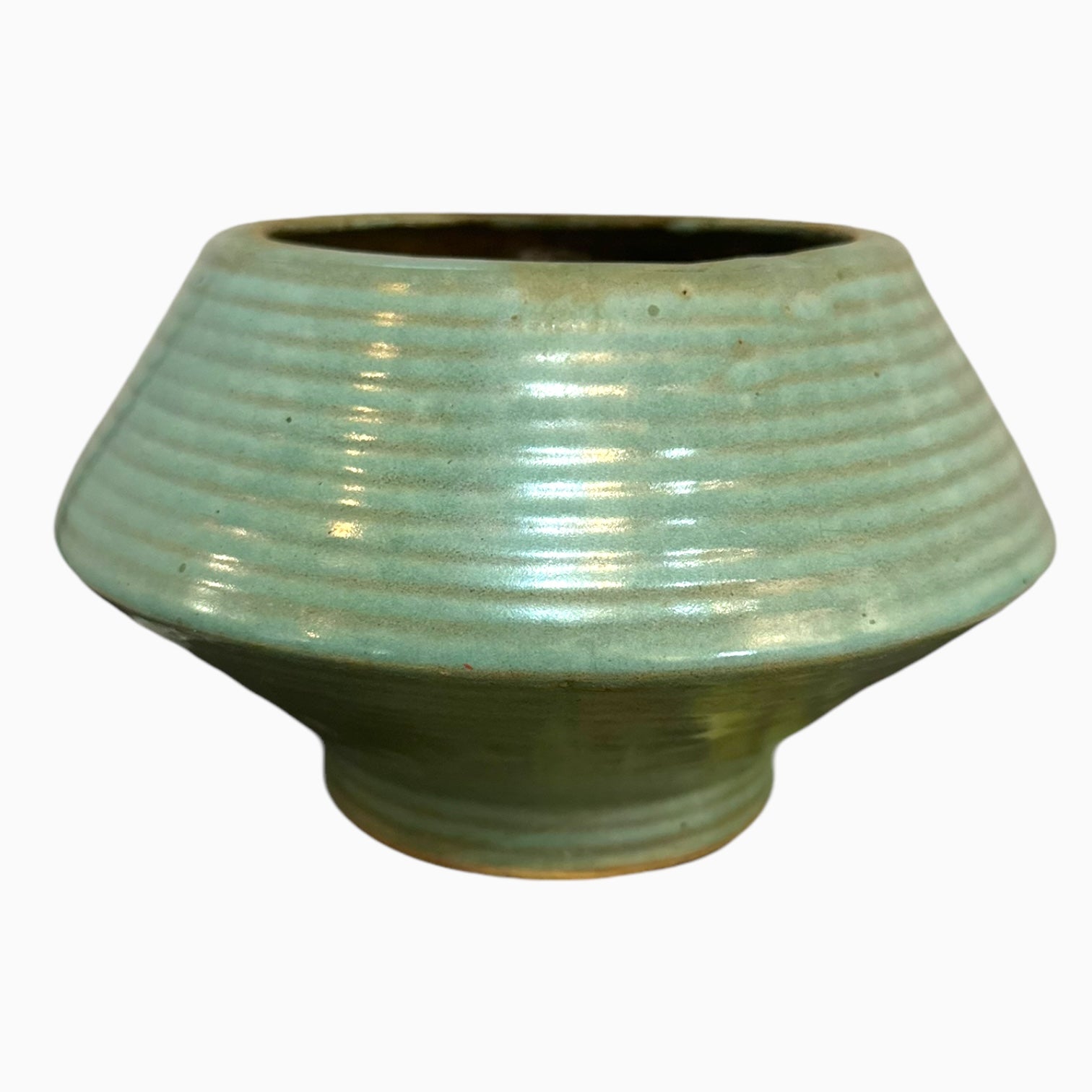 Mid-century ridged pottery vase with pale green color and modernist shape.