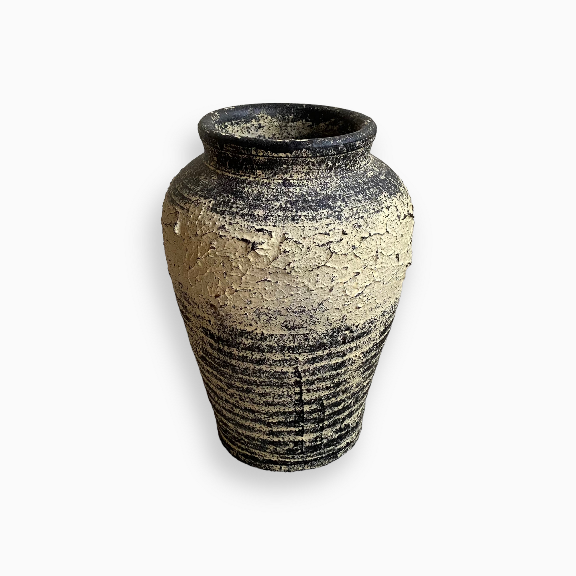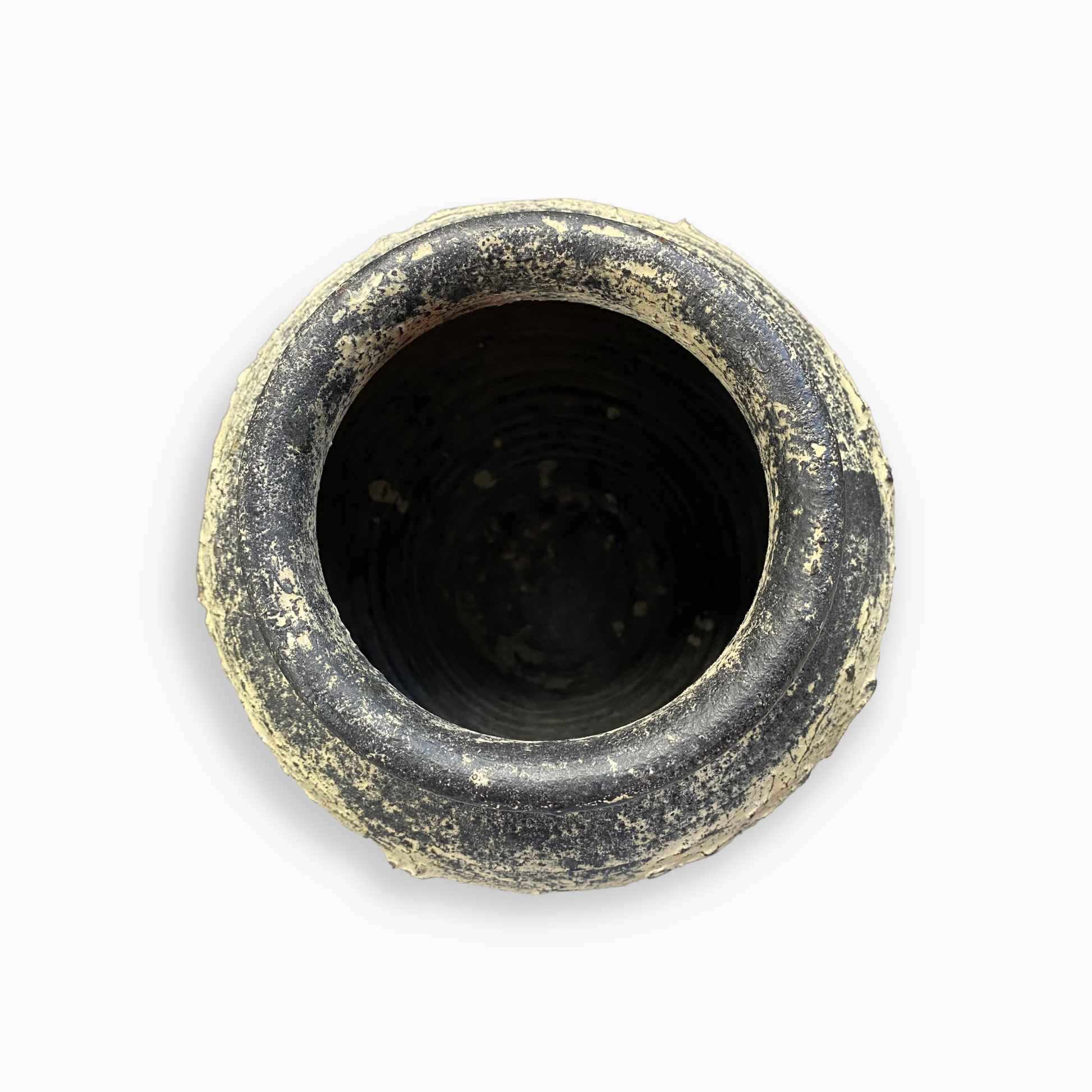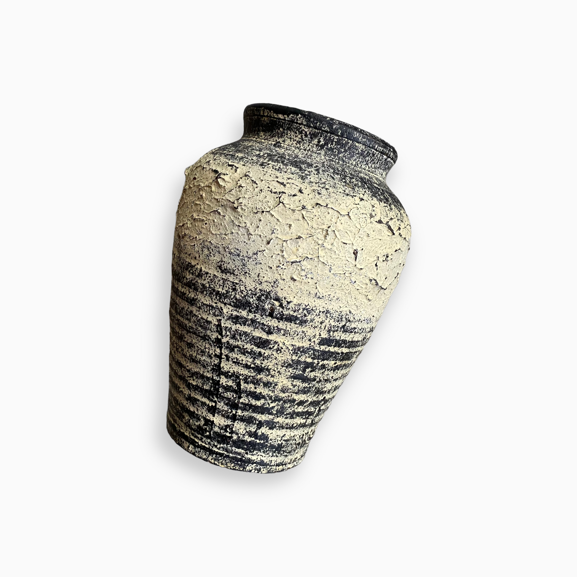 Beautifully textured black and cream vase with rustic unglazed finish. In good vintage condition with minor imperfections that fit the vibe.