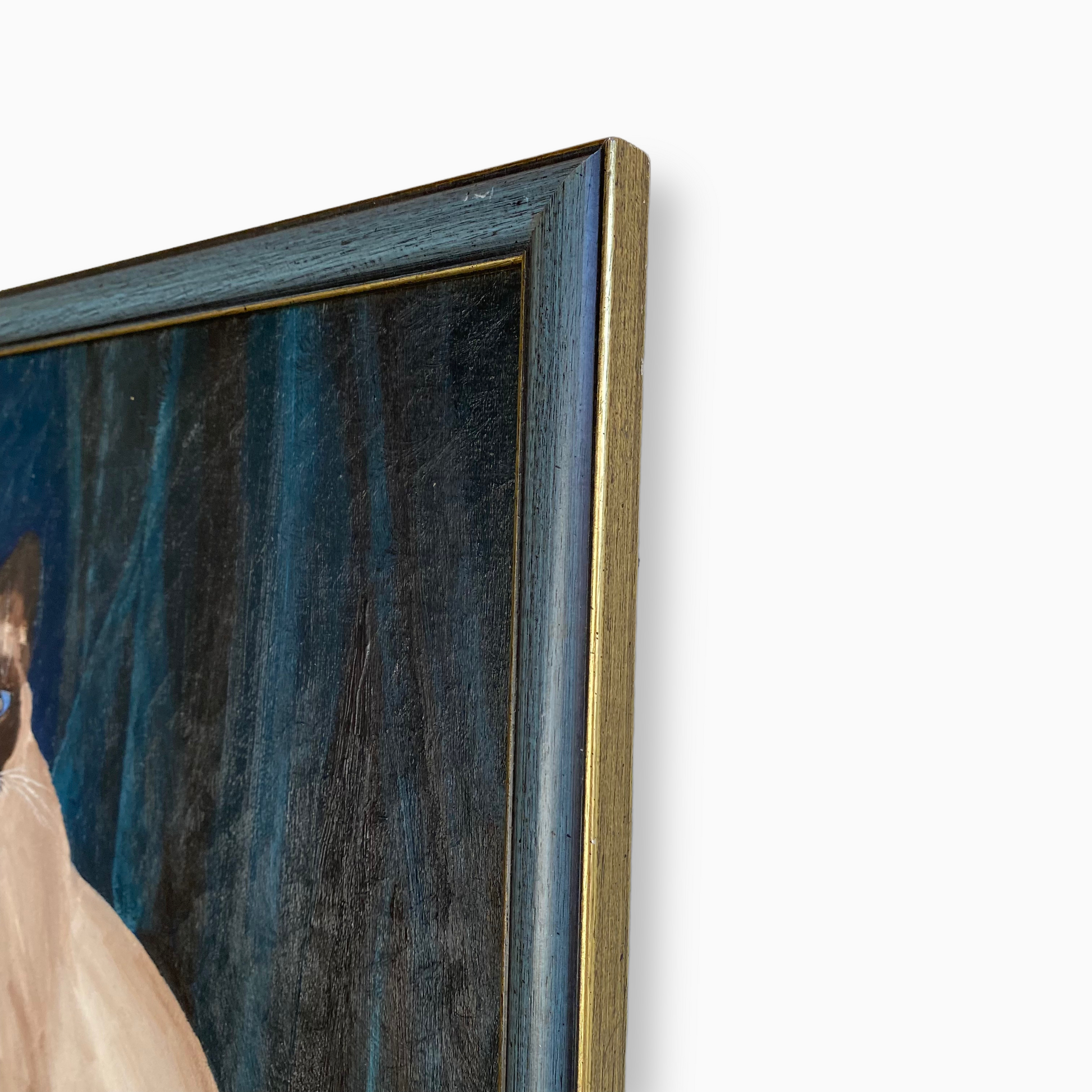 Oil painting of a siamese cat posing in front of a blue background. In blue and gold painted frame.