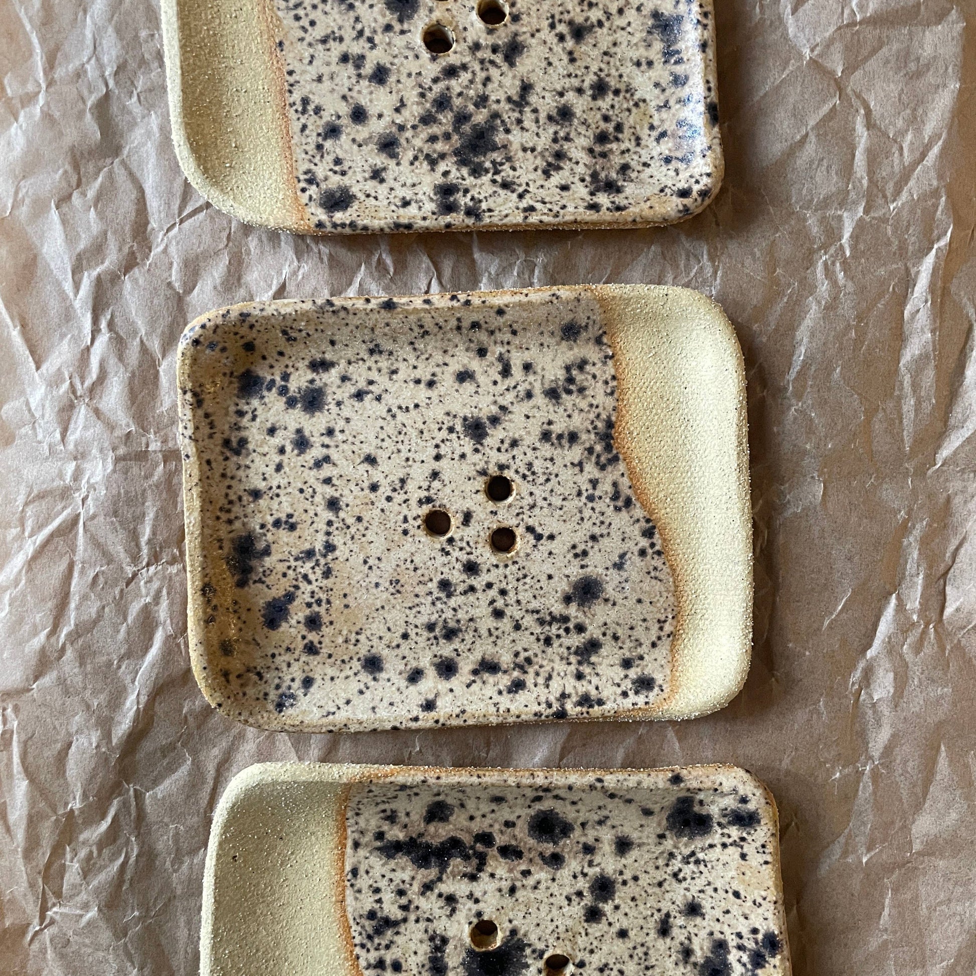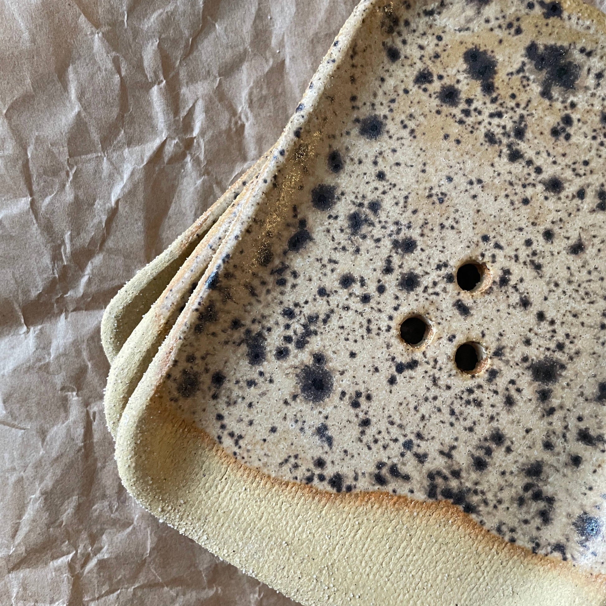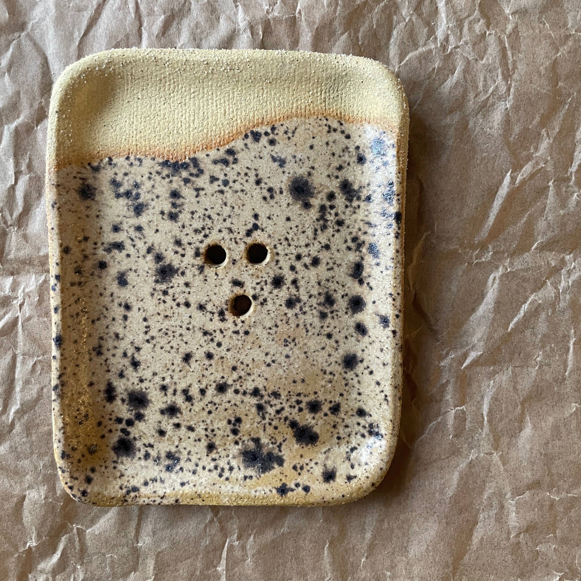 Handmade soap dish. Created using recycled clay bodies. Three drainage holes for optimal bar longevity. Sanded smooth underneath for most sinks and countertops.