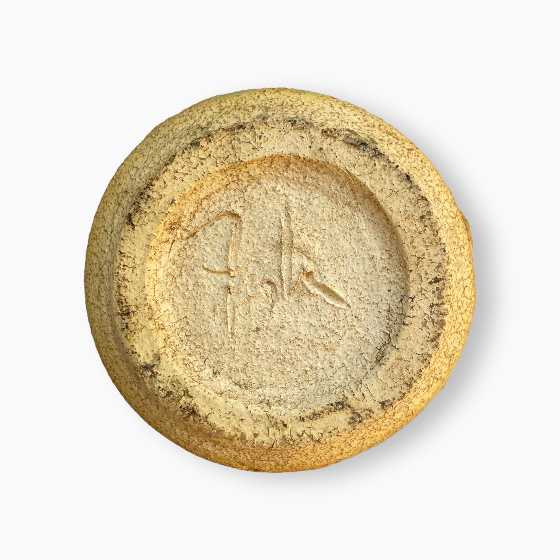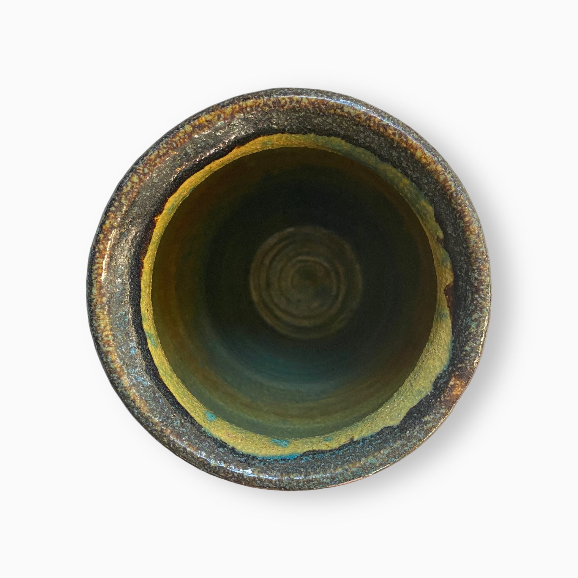 Hand-made vase with yellow clay base, teal glazed body and dark blue glaze on neck/shoulder. In good condition, with no chips or cracks. Artist's signature on bottom.
