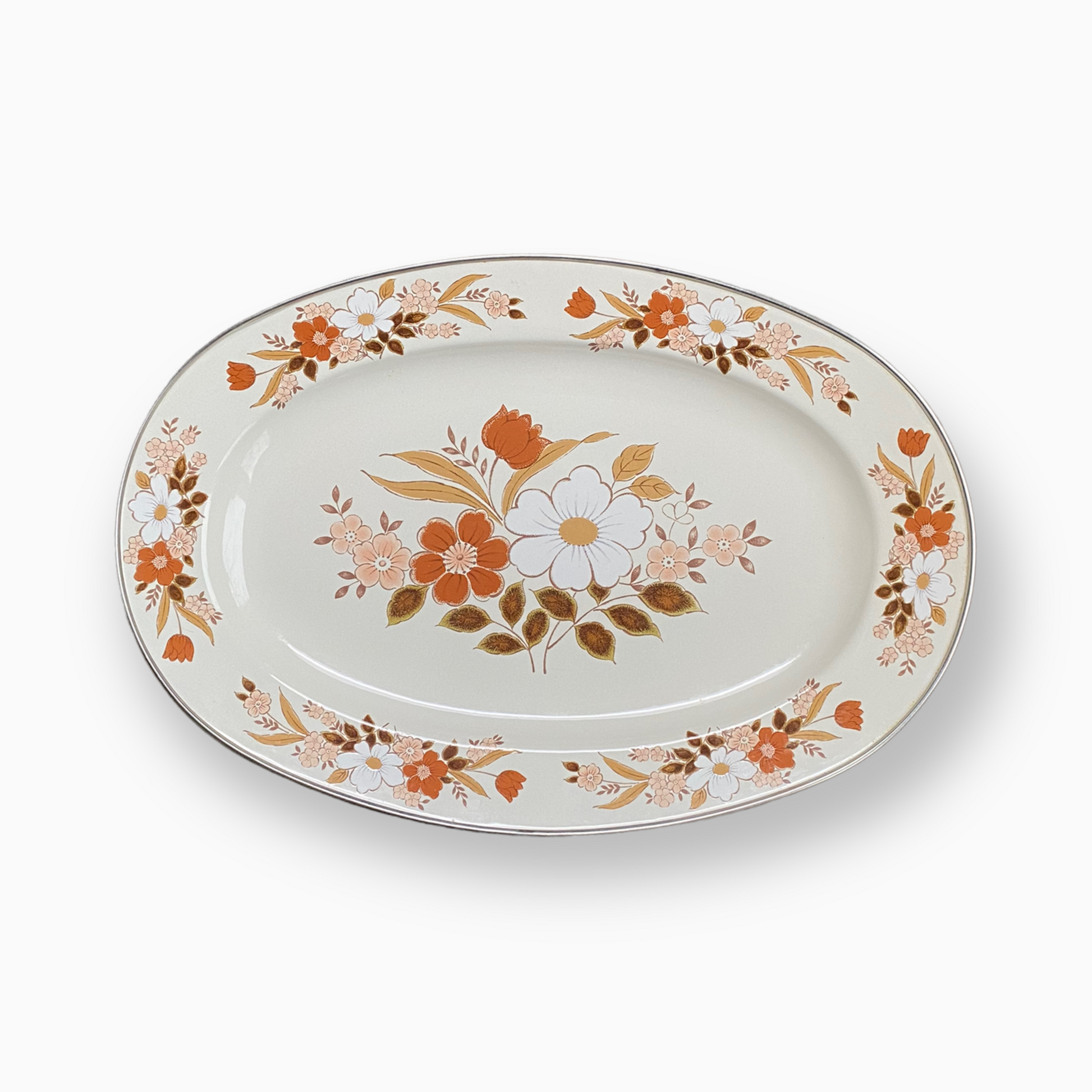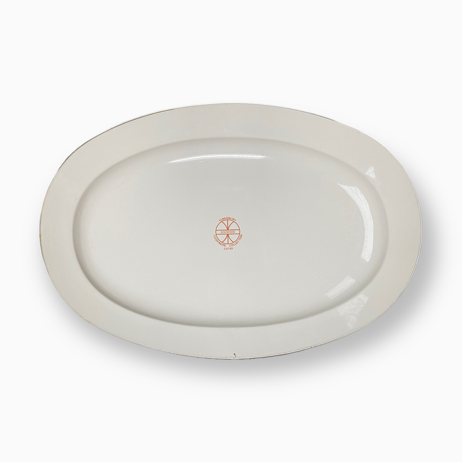 Oval serving platter made by Kingsbury Cookware Collection with dogwood pattern. Porcelain on metal. In good vintage condition.