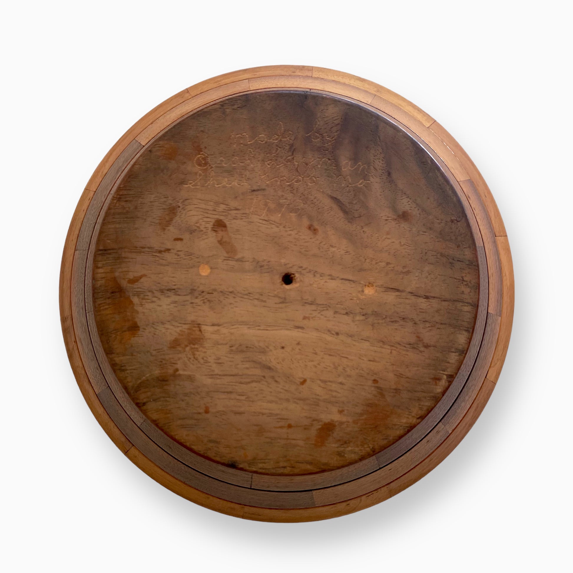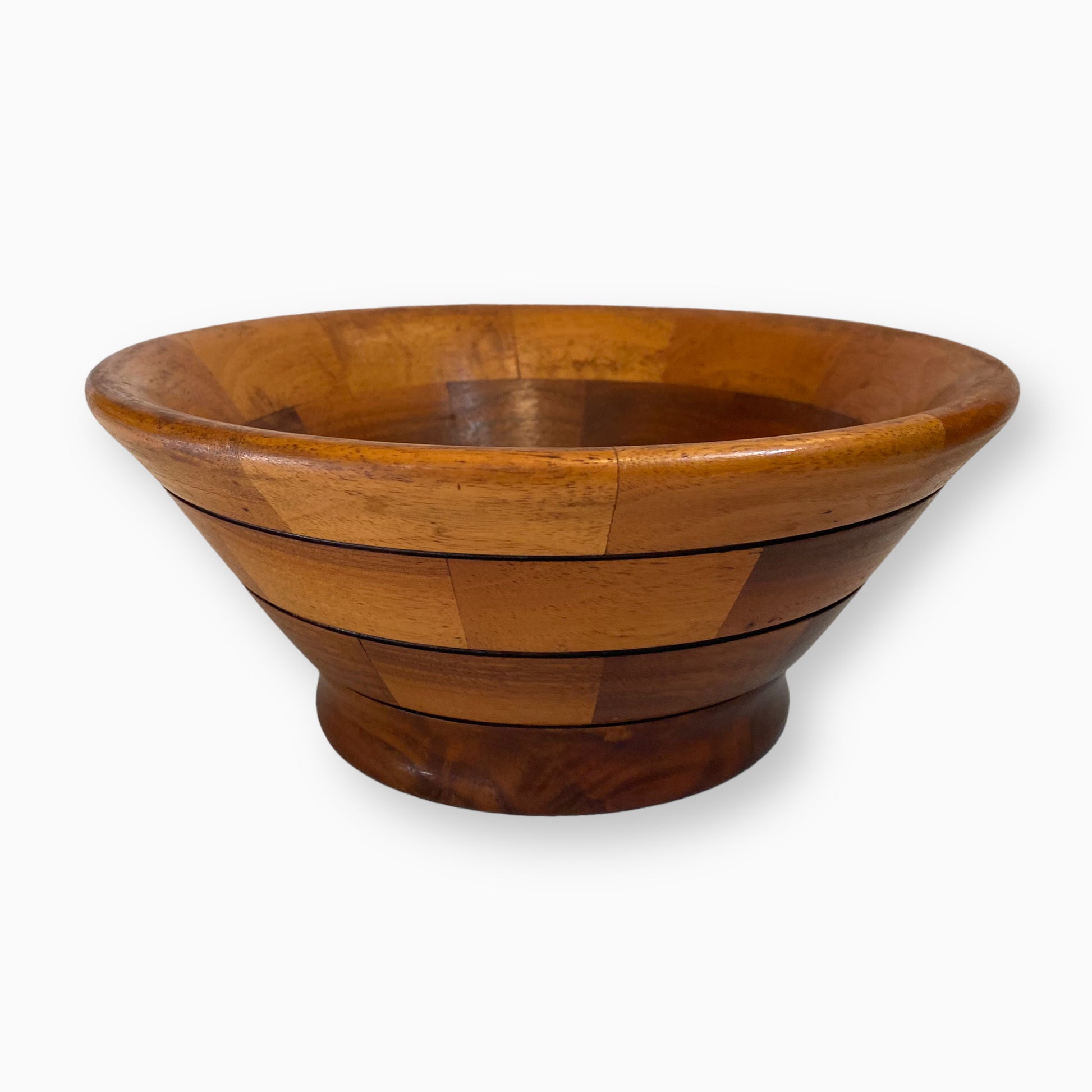 This vintage hand-turned wooden bowl was crafted by a Missouri gentleman named Oral Layman in 1973, who clearly had a knack for intricate design and precise craftsmanship. In good vintage condition.