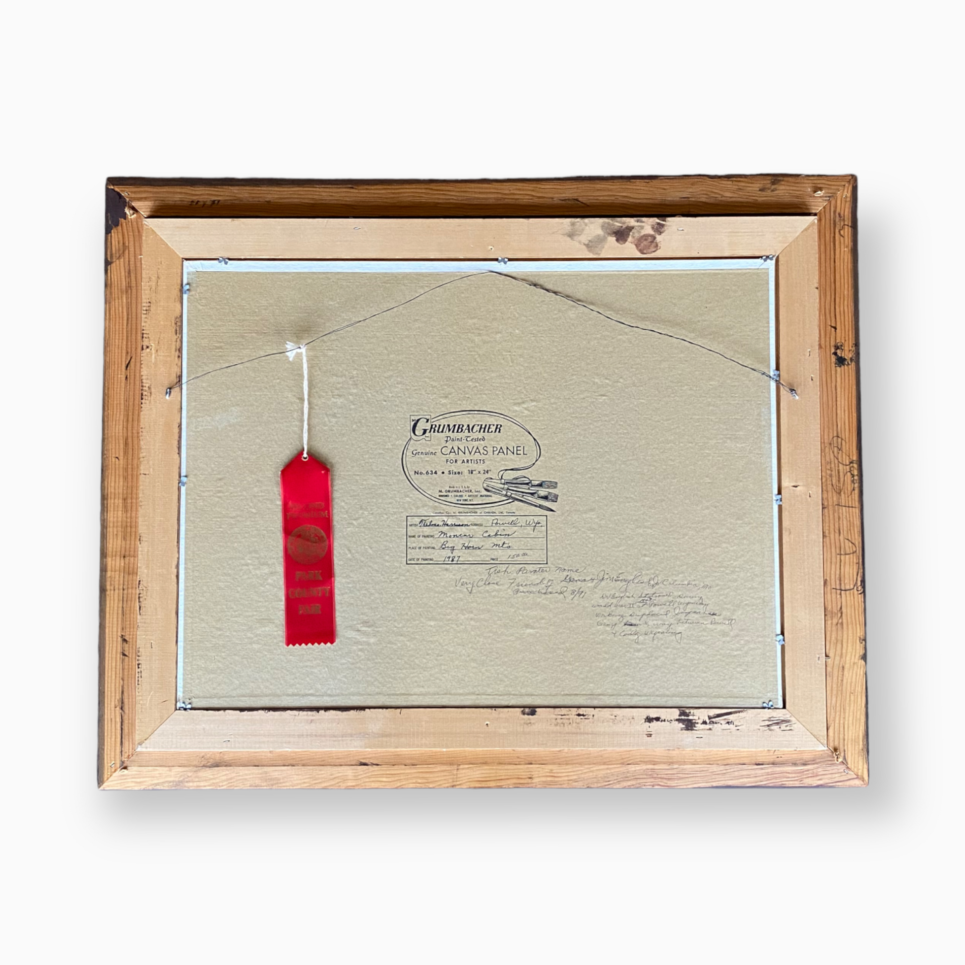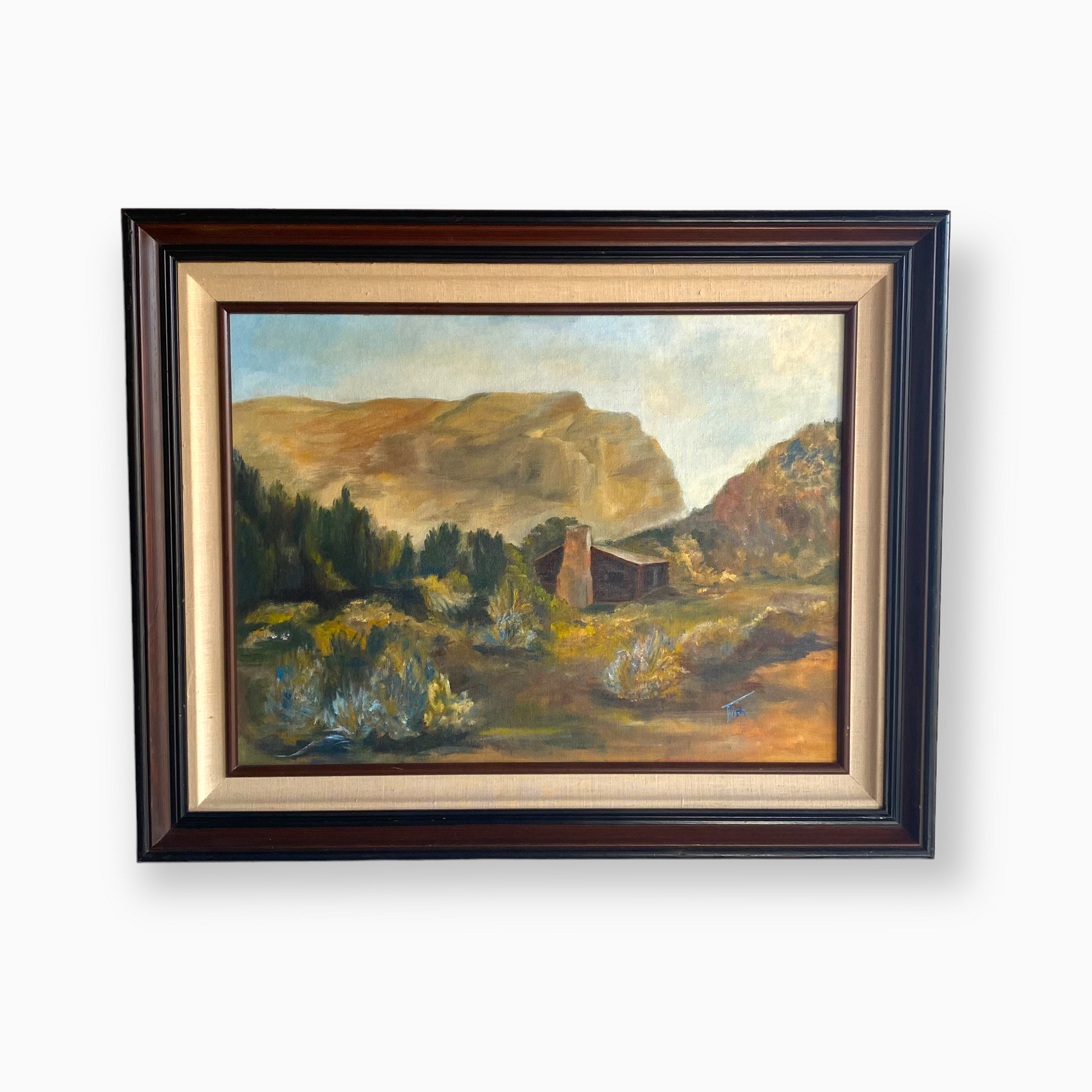 Lovely oil painting of a cottage set in front of the Bighorn Mountains. Signed by Thelma "Tish" Harrison, circa 1987. Won "Second Premium" at the Park County, Wyoming fair.